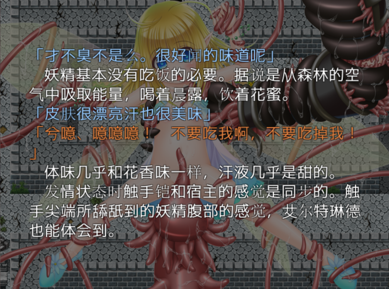 本作说的是一个国家在爆发怪物攻城以后,整个国家都沦陷了,在这样的情况下,我们的新晋女骑士在保护公主撤退的时候被队长击昏带出了城堡得以幸存下来!之后,又被开国魔法师所救,为了能够救回公主,光复帝国,我们的女主选择了穿上触手服,成为魔物娘。